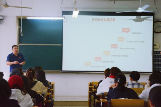 徐凤聚焦新生学业成长与职业发展需求,从“端正学习态度、细化学业规划、深耕专业竞赛”等方面提出具体要求,强调日语能力的提升需依托持续积累与刻苦练习,并现场细致解答新生关于学业绩点、专业发展等方面的疑问。她强调,大学学习是一场考验毅力与定力的“持久战”,唯有以勤勉为基、以坚持为要,方能在专业领域学有所成、学有所获。