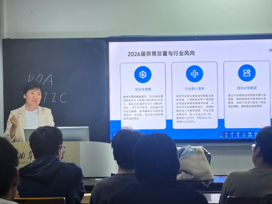 随后,刘明聚焦求职实操环节,引导学生通过岗位核心要素精准解码企业招聘需求。她着重强调了简历“靶向优化”的重要意义,细致分享了面试沟通策略与应答技巧,同时提醒学生警惕各类求职诈骗风险。针对考公考编,她明确不同单位的报考门槛、选拔侧重与备考方案,点明应届生的竞争优势,进一步建议学生合理分配求职与备考时间,助力“求职-备考”双线高效推进。